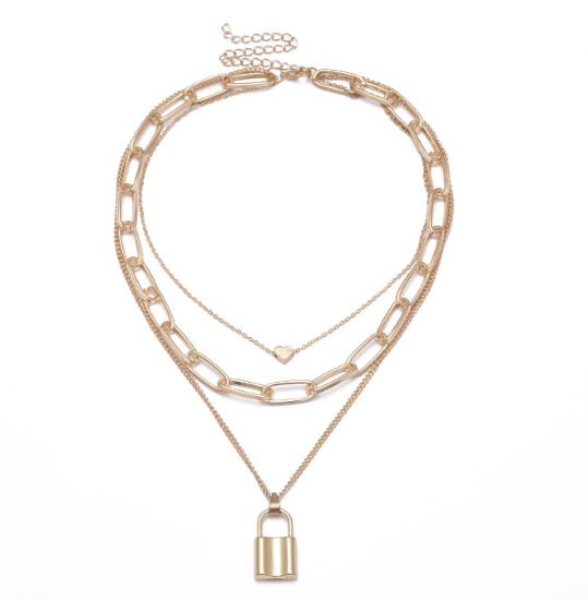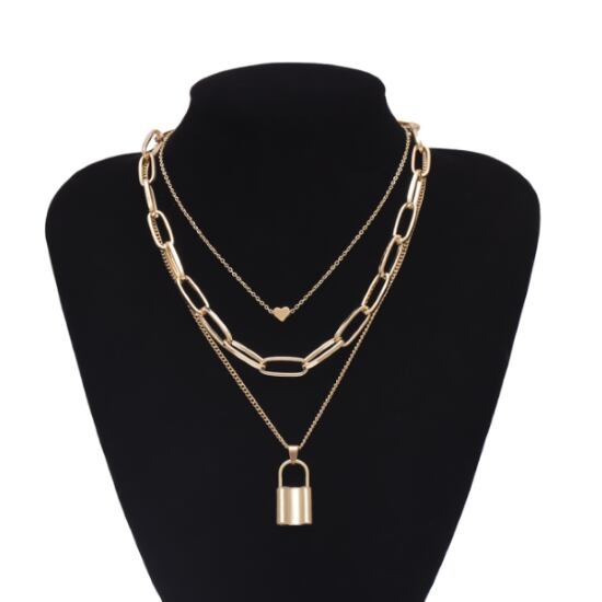ネックレス レディース アクセサリー ペンダント 三連 ハートモチーフ チェーンネックレス 南京錠 ロングネックレス カジュアル おしゃれ ファッション メタル ゴールド シルバー 金 銀 女性