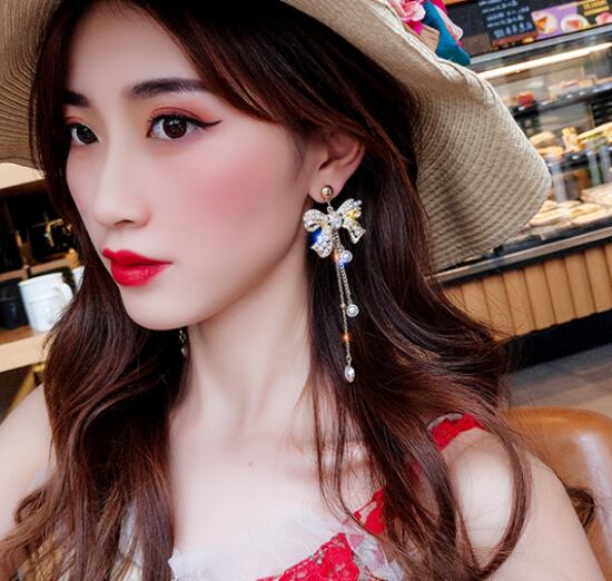 パールとラインストーンが輝くロングピアス。