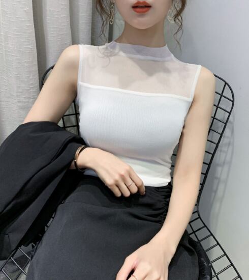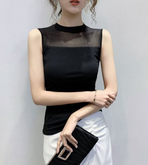 タンクトップ レディース トップス ノースリーブ カットソー モックネック シースルー メッシュ シンプル 無地 夏 カジュアル お出かけ おしゃれ きれいめ インナープルオーバー タンクトップ 女性