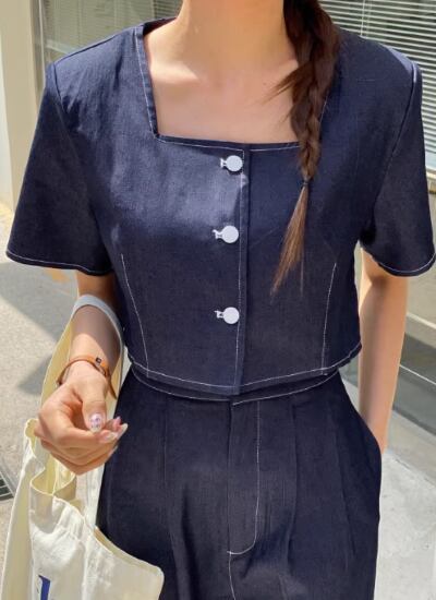 デニムセットアップ レディース ツーピース 上下セット 2点セット トップス クロップド丈 ショート丈 半袖 スクエアネック フロントボタン ボトムス ワイドパンツ 長ズボン ハイウエスト デニム