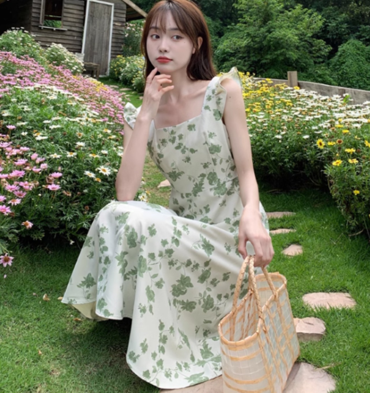リゾートワンピース レディース ワンピース ミドル丈ワンピース 膝丈ワンピース ノースリーブワンピース 花柄 フラワー フリル スクエアネック レトロ ハイウエスト プルオーバー カジュアル 夏