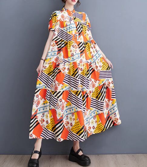 ロングワンピース レディース ワンピース シャツワンピース スタンドカラー ゆったり ルーズシルエット 総柄 華やか 半袖ワンピース 鮮やか Aラインスカート カジュアル お出かけ おしゃれ 可愛い