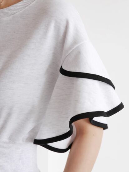 半袖ワンピース レディース ワンピース フリル袖 パイピング バイカラー コントラストカラー ハイウエスト ラウンドネック カジュアル お出かけ おしゃれ 春夏 無地 二の腕カバー ミドル丈ワンピース