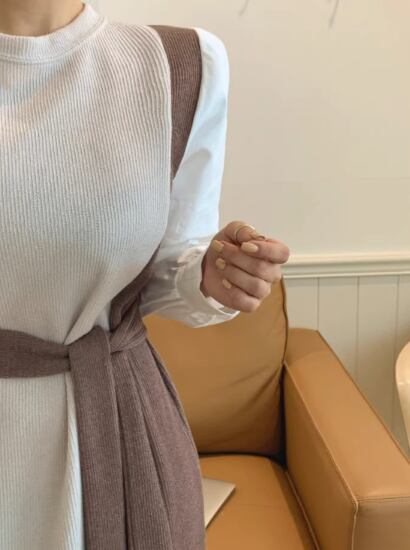 ゆったりとしたニットベスト風のバイカラーがかわいいワンピース。