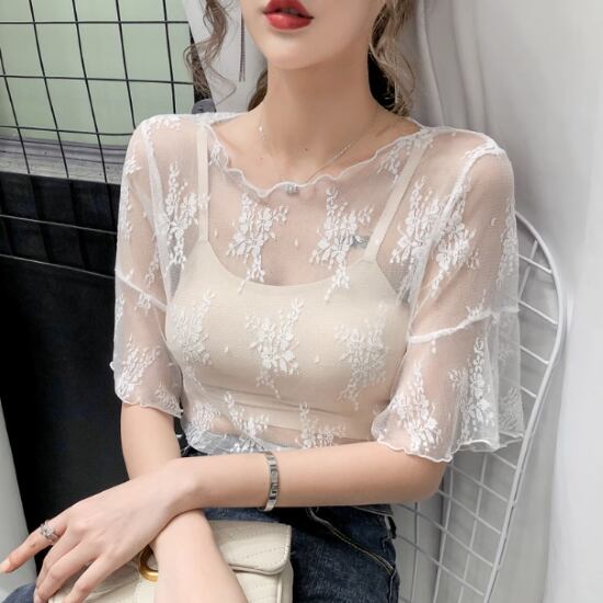 メッシュカットソー レディース トップス シースルー シアートップス 半袖 花柄 フラワー 重ね着 レイヤードスタイル ラウンドネック カジュアル お出かけ おしゃれ きれいめ メッシュ シアー 女性