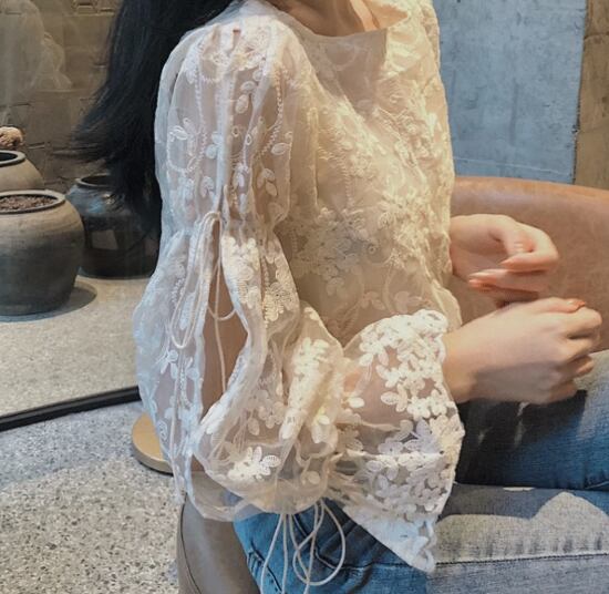 レースブラウス レディース ブラウス トップス レース 刺繍 長袖 シースルー コットン 綿 ボリューム袖 カジュアル お出かけ おしゃれ きれいめ エレガント ラウンドネック プルオーバー ブラウス