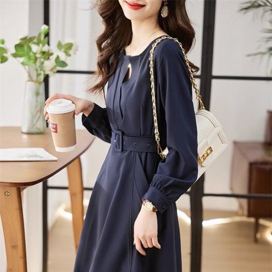 ワンピース レディース Vネック 長袖 ベルト付き キーネック ミディアム丈 ミモレ丈 Aライン フレアスカート きれいめ 上品 エレガント おでかけ 通勤 オフィス 結婚式 パーティー お呼ばれ