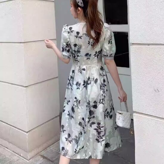 ロングワンピース 花柄 夏新作 フレアワンピース 半袖 パフスリーブ Aライン 着痩せ ミモレ丈 ロング丈 花柄ワンピース フレアスカート オフィススタイル 通勤 上品 きれいめ デート お呼ばれ