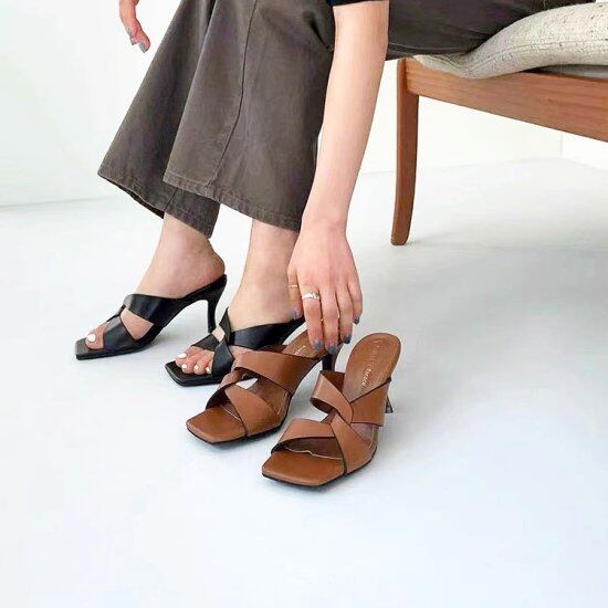 ひねりのあるクロスデザインがおしゃれなヒールサンダル。