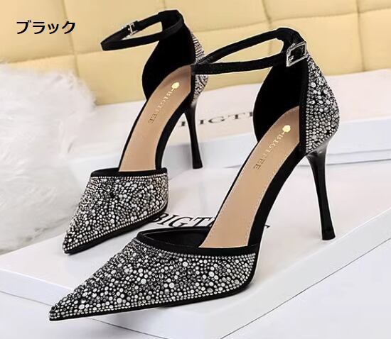 パーティーシューズ レディース パンプス 靴 シューズ ラインストーン きらきら アンクルストラップ ポインテッドトゥ ハイヒール ピンヒール 美脚 脚長 きれいめ エレガント お呼ばれ フォーマル