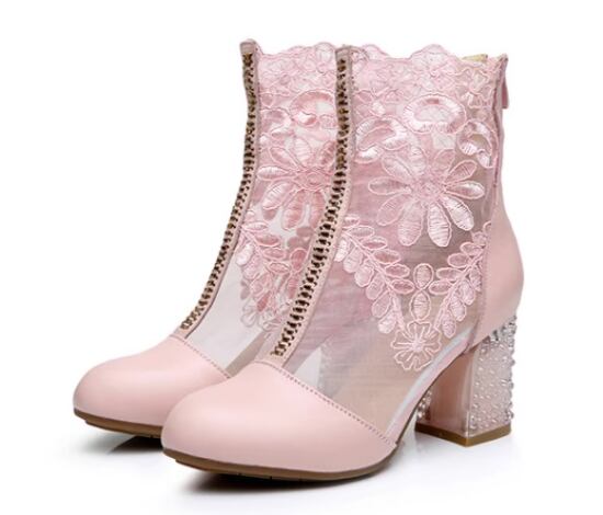 パーティーシューズ レディース ブーツ 靴 シューズ メッシュ シースルー レース バックジッパー 太ヒール チャンキーヒール 個性的 アンクルブーツ きれいめ エレガント おしゃれ 美脚 脚長