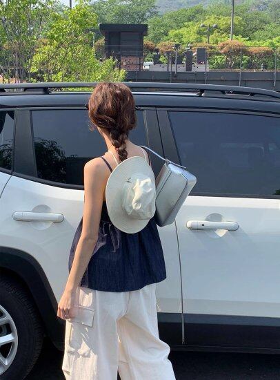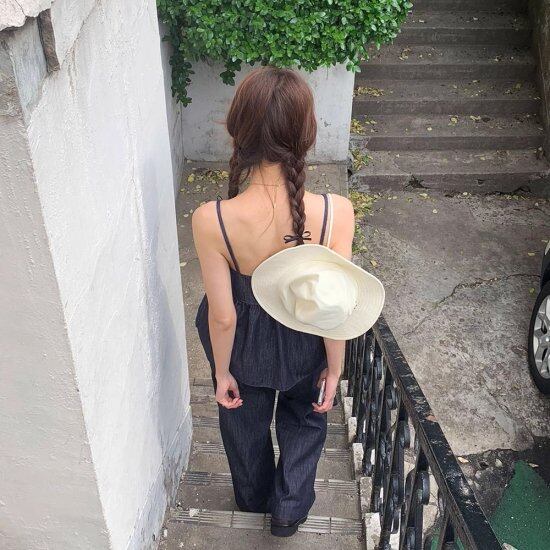 セットアップ レディース デニム ペプラム キャミソール フリル Vネック ワイドパンツ ウエストゴム カジュアルパンツ ゆったり 体型カバー レトロ 上下セット カジュアル リゾート バカンス 夏