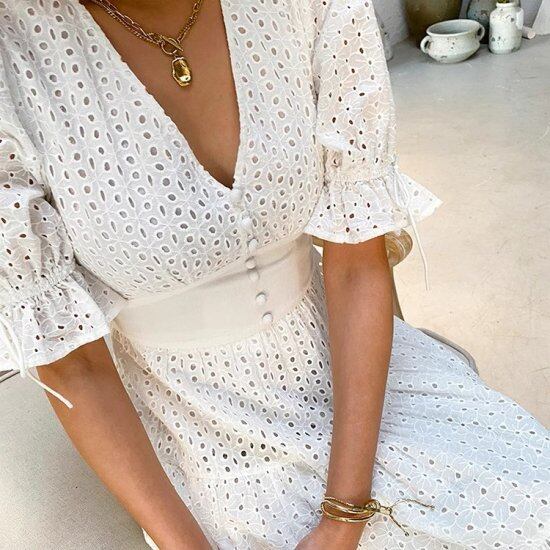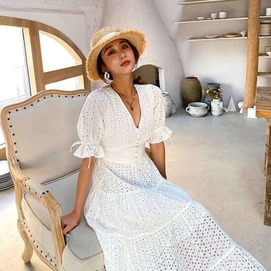 ワンピース レディース レース Vネック ティアードワンピース ハイウエスト パフスリーブ 透かしレース パンチング コットン かわいい きれいめ 上品 ガーリー リゾート バカンス お呼ばれ 夏
