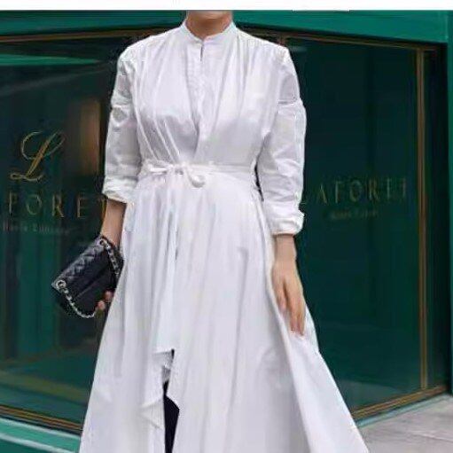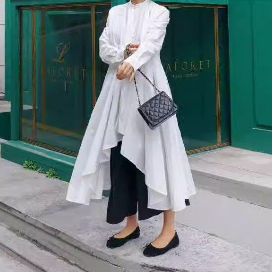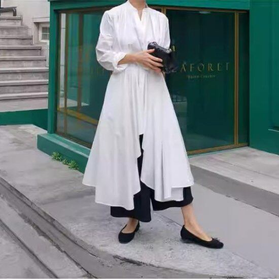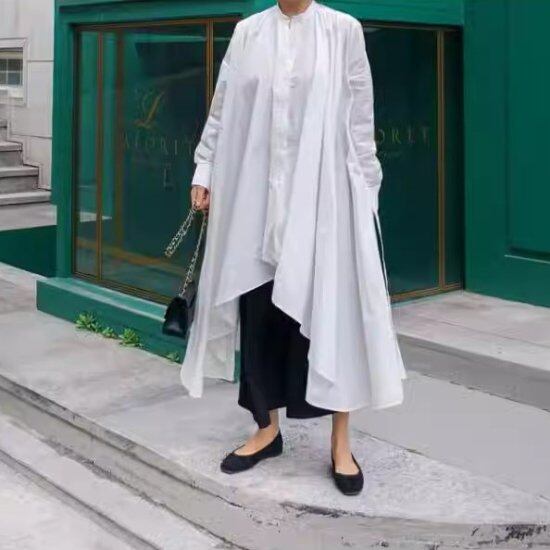 ロングシャツ レディース アシンメトリー 長袖 キーネック ノーカラー 無地 コットン オーバーサイズ 体型カバー きれいめ カジュアル 大人カジュアル 上品 個性的 ロング丈 ブラウス シャツ