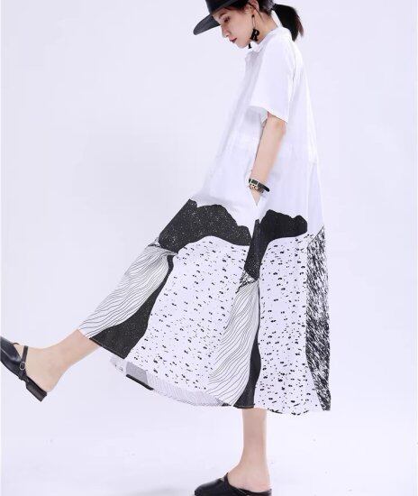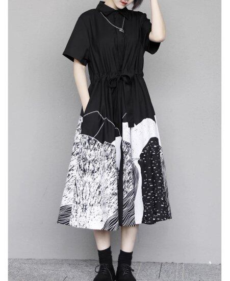 ワンピース レディース シャツワンピース 半袖ワンピース 個性的 プリントワンピース グラフィック 幾何学模様 シャツカラー ウエストリボン レトロ Aライン ミモレ丈 ロング丈 体型カバー