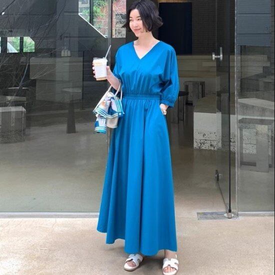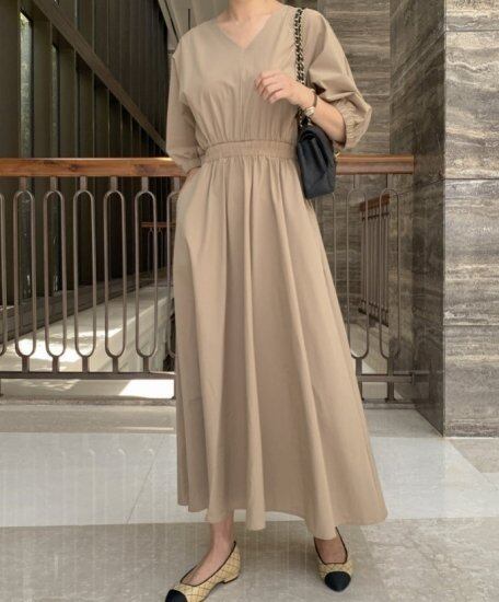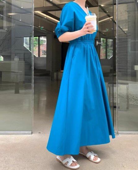 ワンピース レディース Vネック ロングワンピース 半袖 五分袖 パフスリーブ ウエストゴム フレアスカート ハイウエスト 無地 シンプル きれいめ カジュアル オフィス リゾート バカンス