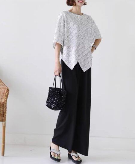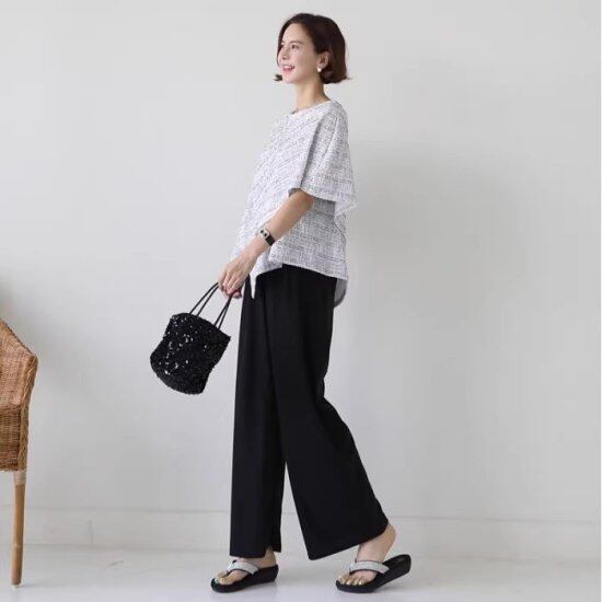 ワイドパンツはウエストゴムできれいめなのに楽な着心地♪