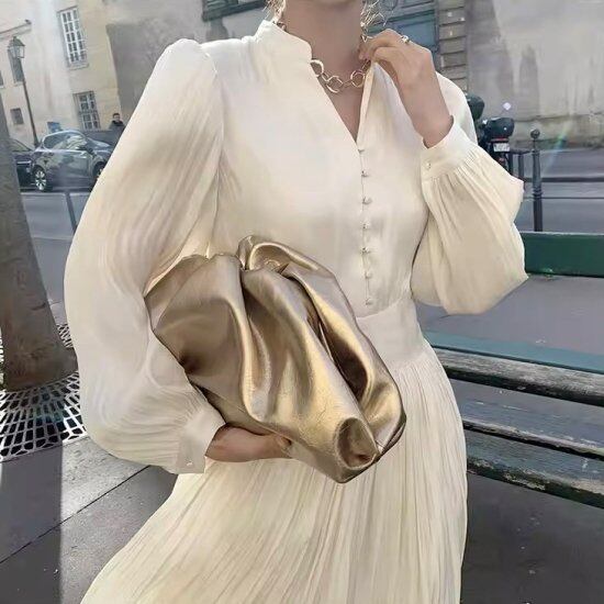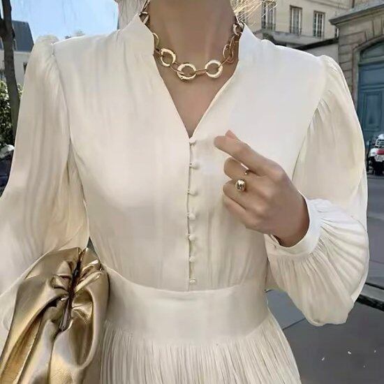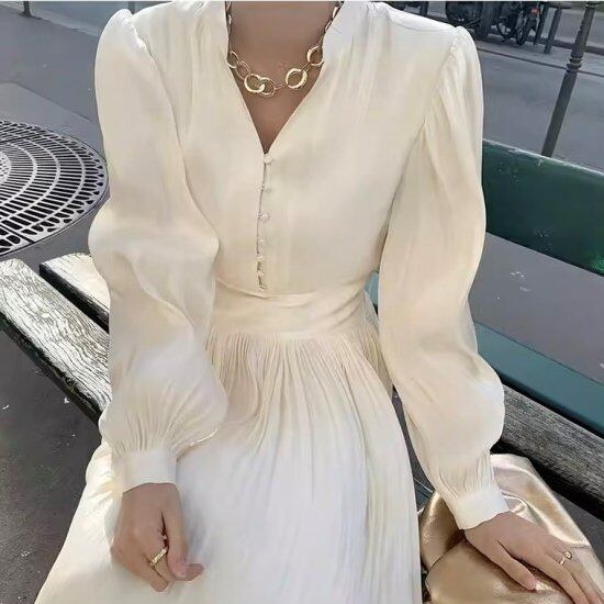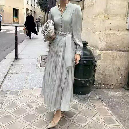 ロングワンピース ゆったり マキシワンピース 長袖 Vネック ランタンスリーブ プリーツスカート ハイウエスト ロング丈 フレアスカート シンプル 無地 光沢感 オフィス 通勤 きれいめ 着回し