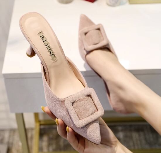 パンプス レディース 靴 シューズ ミュール ポインテッドトゥ スクエアバックル スエード ハイヒール 美脚 脚長 カジュアル お出かけ おしゃれ きれいめ シンプル 無地 ミュールパンプス 女性