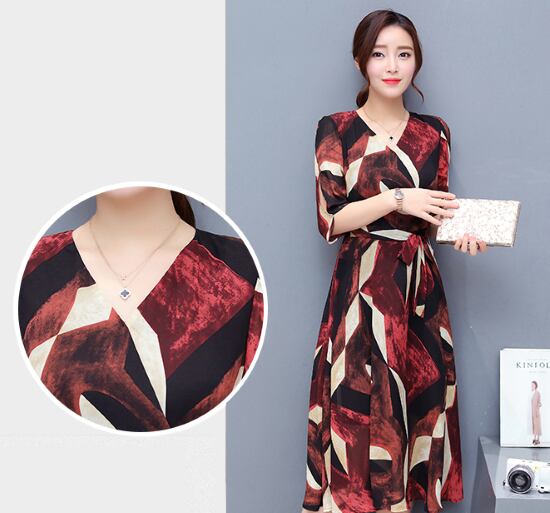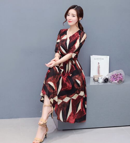 五分袖ワンピース レディース ワンピース ミドル丈 Vネック きれいめ ウエストリボン ハイウエスト 五分袖 プリント カジュアル お出かけ おしゃれ きれいめ シフォンワンピース 女性 個性的