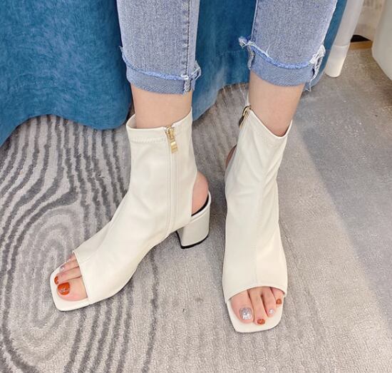 サマーブーツ レディース ブーツ 靴 シューズ ショートブーツ オープントゥ スクエアトゥ かかと開き 太ヒール チャンキーヒール サイドジッパー 無地 カジュアル お出かけ おしゃれ ファッション