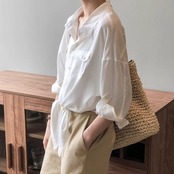 シャツ レディース 長袖 デザイン センス ニッチ 春 秋 夏 レトロ 香港風 タイアップ プチ ミッドスリーブ フレンチ ショート 日焼け止め トップ ブラウス レディースシャツ 長袖 ロールアップ 無地 カジュアル オープンカラー 開襟シャツ