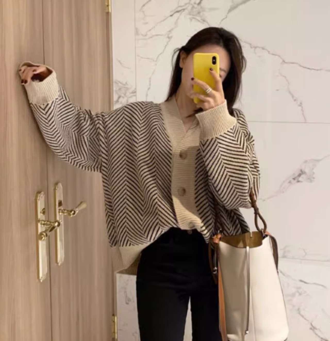 おしゃれな総柄模様のニットカーディガン。