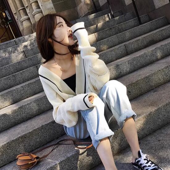コントラストカラーのラインデザインがおしゃれなニットカーディガン。