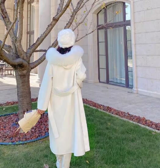 ふわふわファーフード付きのロングコート。