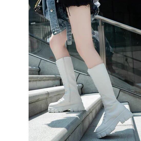 ロングブーツ レディース レースアップ 編み上げブーツ 厚底ブーツ フェイクレザー エコレザー 無地 白 黒 サイドファスナー ハーフブーツ ストリート カジュアル 歩きやすい 靴 ブーツ おしゃれ