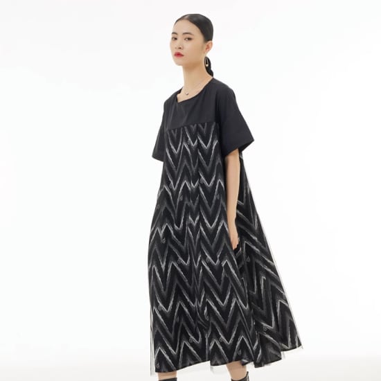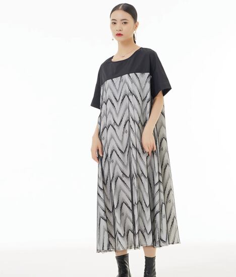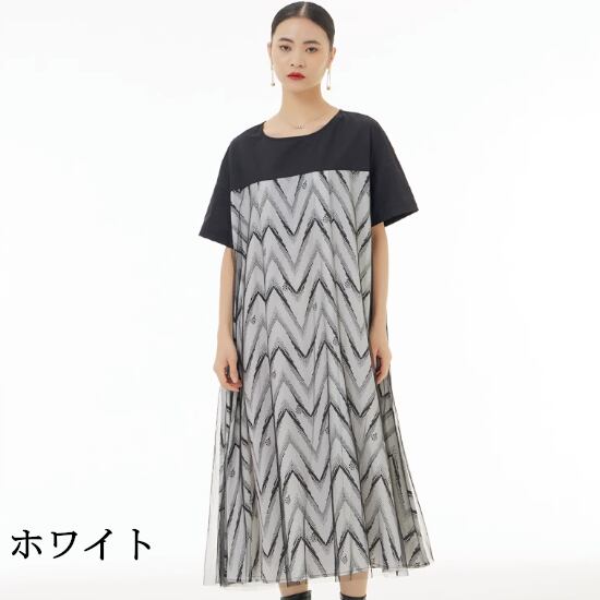 ロングワンピース 波柄 大きいサイズ レディース 半袖 ロング丈 ラウンドネック フリーサイズ ストリート 2色 上品 通勤 お出かけ 発表会 休日 女子会 ショッピング 20代 30代 40代 夏