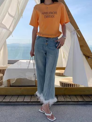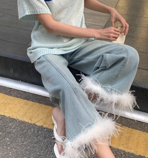 デニムパンツ 羽根 大きいサイズ レディース ジーンズ デニム ジーパン ボトムス ハイウエスト ロング ストレート ライトブルー 女子会 デート アウトドア お出かけ プール 20代 30代 春 夏