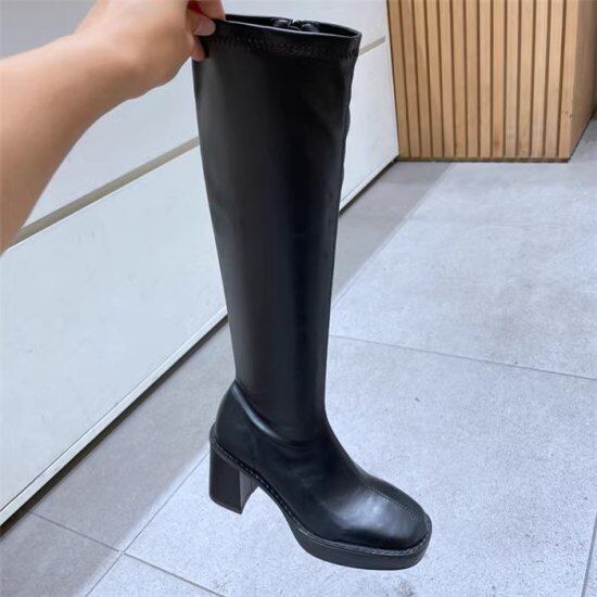 ロングブーツ レディース 厚底ブーツ スクエアトゥ 太ヒール チャンキーヒール ハイヒール 7.5cmヒール フェイクレザー エコレザー スリム ステッチ きれいめ カジュアル おしゃれ 靴 ブーツ
