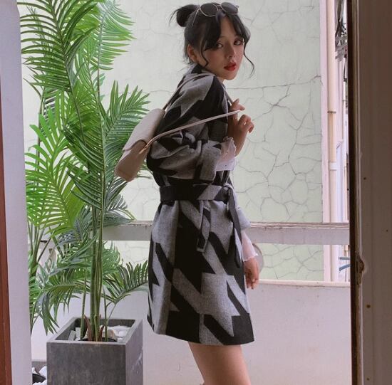 ミドル丈コート レディース アウター 羽織 長袖コート ミドル丈 コート 千鳥格子柄 ウエストベルト 襟あり スーツ襟 レトロ ウールコート カジュアル お出かけ おしゃれ 厚手 秋冬 ファッション