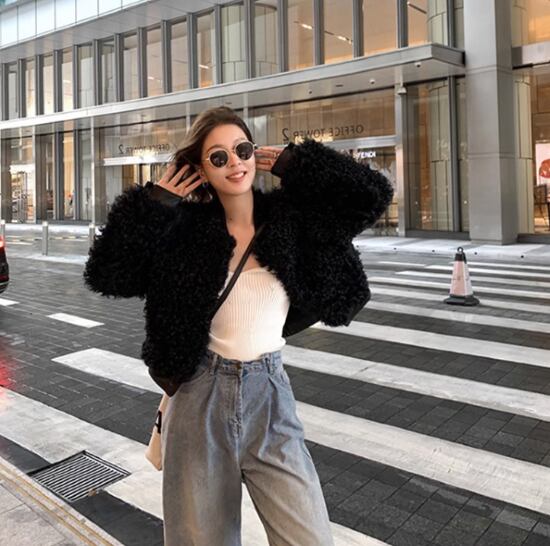 ボアジャケット レディース アウター 羽織 ボアコート ショート丈ジャケット クロップド丈 長袖ジャケット ふわふわ もこもこ ラウンドネック ボリューム 黒 ブラック カジュアル おしゃれ お出かけ