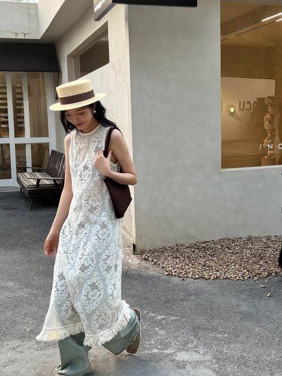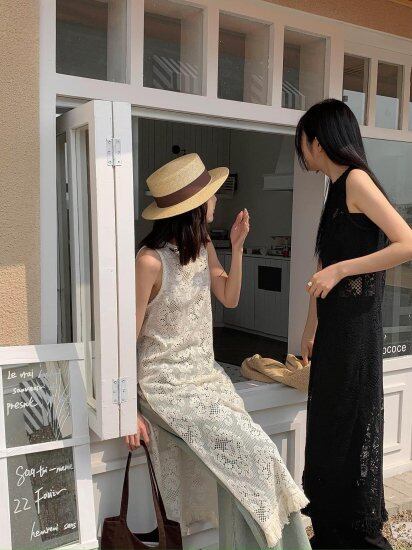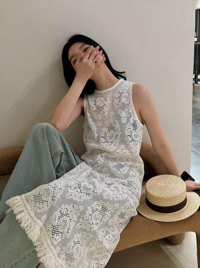 ロングワンピース ノースリーブ 大きいサイズ レース ロング丈 ラウンドネック 韓国 無地 シンプル 袖なし 2色 可愛い 通勤 デート 女子会 お出かけ 休日 イベント 体型カバー 20代 春夏
