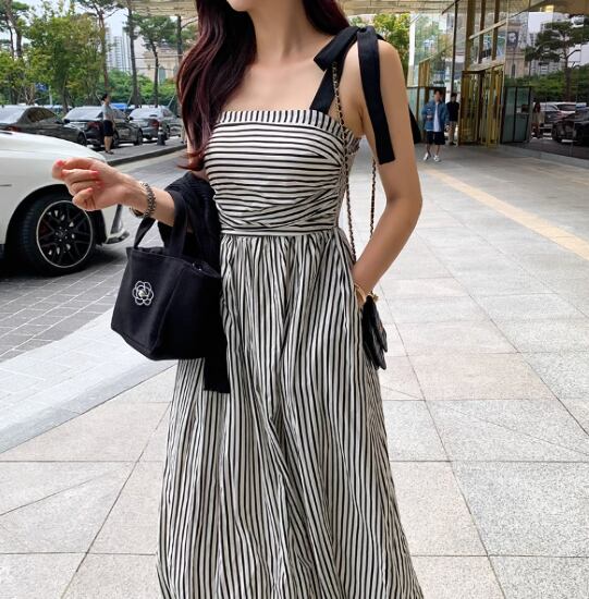 ロングワンピース レディース ワンピース ノースリーブワンピース ストラップ 肩リボン ストライプ カジュアル お出かけ おしゃれ ハイウエスト ロング丈 ポケット 夏 ファッション 女性 ワンピ
