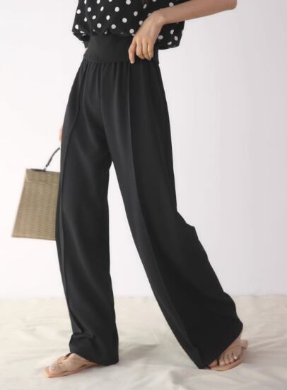 ドット柄の半袖トップスとワイドパンツのセットアップ。