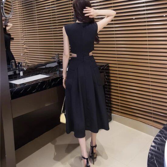 ロングワンピース レディース サイドカット 肌見せ ノースリーブワンピース カットワーク ラウンドネック フレア 無地 ミモレ丈 結婚式 二次会 パーティードレス きれいめ エレガント おしゃれ