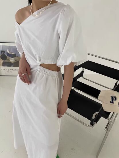ロングワンピース レディース ワンピース 半袖ワンピース ワンショルダー オフショルダー パフスリーブ ハイウエスト アシンメトリー ウエスト開き 肌見せ カジュアル お出かけ シンプル 無地 女性
