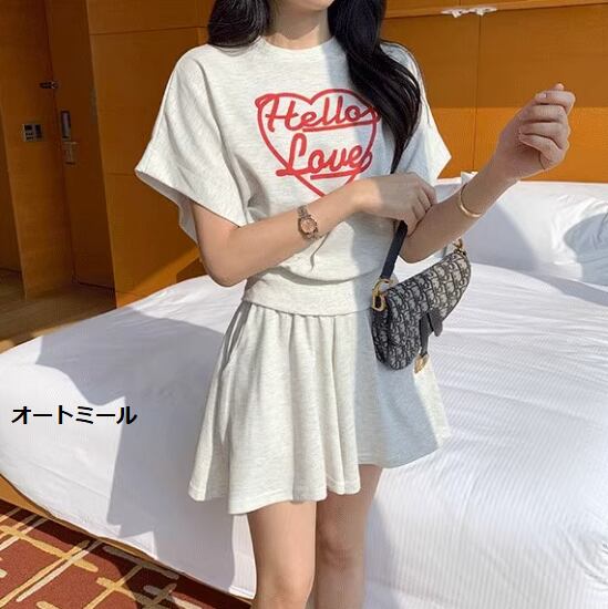 セットアップ レディース 上下セット 2点セット ツーピース トップス 半袖 Tシャツ ラウンドネック プリント ハート柄 ボトムス ショートパンツ 綿 コットン スウェット カジュアル おしゃれ