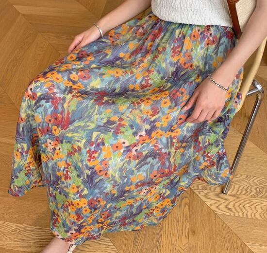 ロングスカート レディース ボトムス スカート ロング丈 プリーツ 小花柄 フラワー ウエストゴム カジュアル お出かけ おしゃれ Aライン ファッション 春夏 シフォンスカート 華やか カラフル