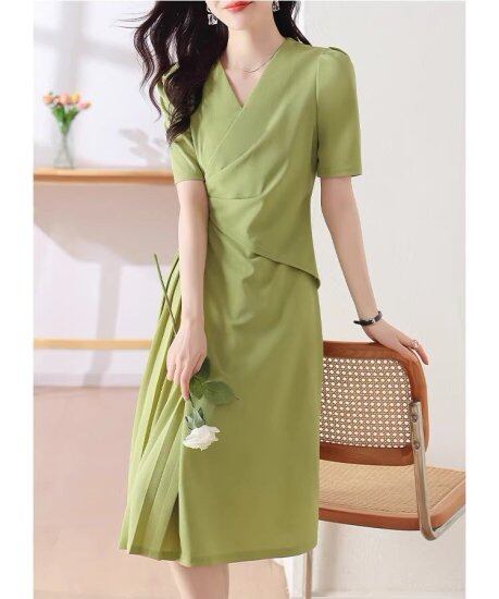 Vネックワンピース レディース 半袖 プリーツ カシュクール アシンメトリー Aライン ミモレ丈 ミディアム丈 結婚式 演奏会 二次会 披露宴 パーティードレス 上品 エレガント オフィスコーデ