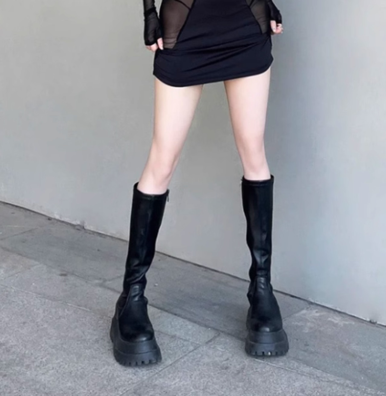 厚底ブーツ レディース ブーツ 靴 シューズ ロングブーツ サイドジッパー ブラック シンプル 無地 カジュアル お出かけ おしゃれ ラウンドトウ 美脚 脚長 ボリューム スリム ファッションブーツ