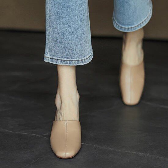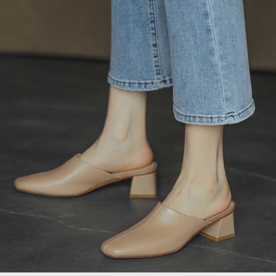 ミュール レディース サンダル スクエアトゥ 太ヒール チャンキーヒール スリッパ レザー レザーミュール 4.5cmヒール 無地 シンプル きれいめ エレガント カジュアル リゾート 靴 おしゃれ