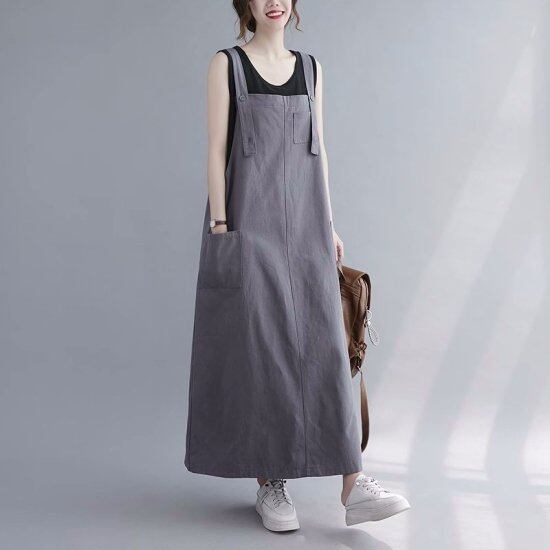 ワンピース ロング ノースリーブ プルオーバー ゆったり レディース グレー Aライン ストラップ ボックス ゆったり ロングワンピース レディース ワンピース 大きいサイズ 韓国風 体型カバー 新作