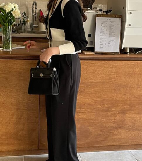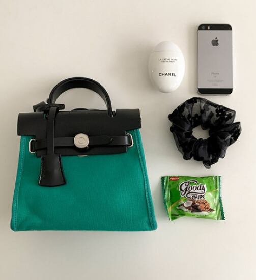 キャンバス地とレザーの組み合わせがおしゃれなハンドバッグ。