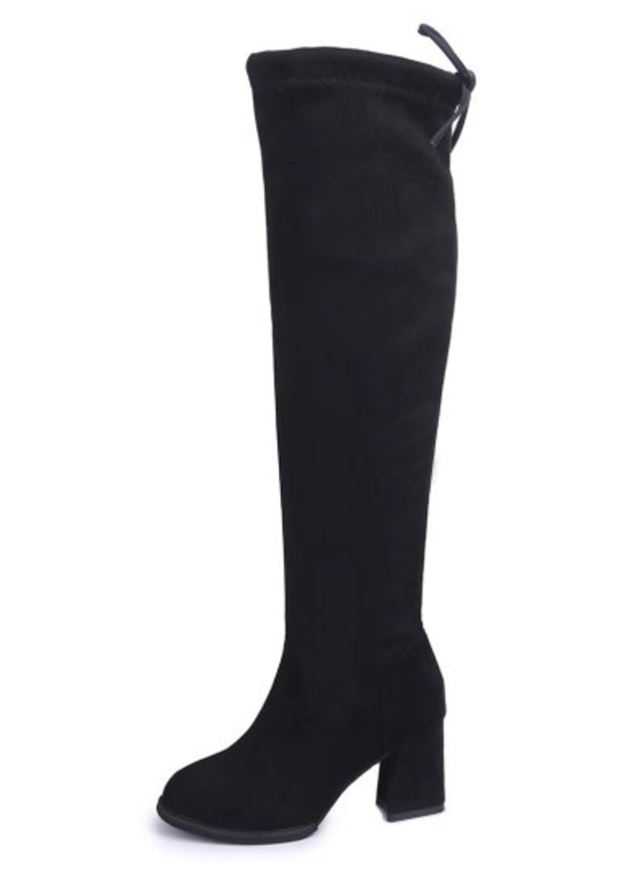 ニーハイブーツ レディース ロングブーツ スエードブーツ リボン ラウンドトゥ ストレッチ ハイヒール 7cmヒール ロング丈 太ヒール チャンキーヒール カジュアル パーティー おしゃれ