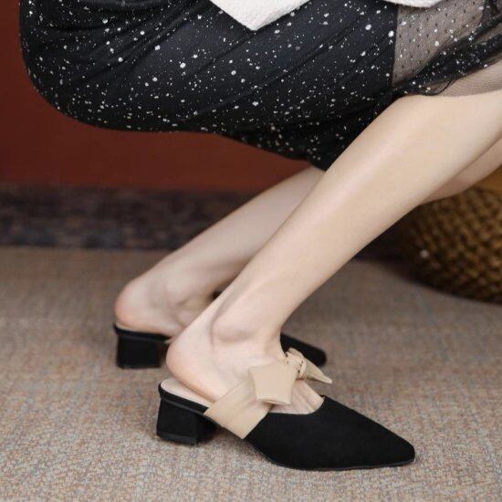 リボンミュール レディース サンダル ポインテッドトゥ リボンストラップ ローヒール 太ヒール 3.5cmヒール ストラップサンダル かわいい きれいめ 上品 エレガント パーティー おしゃれ