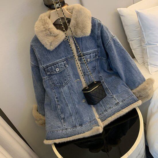 デニムジャケット レディース 大きいサイズ ミディアム丈 レギュラー丈 毛皮 もこもこ モコモコ 襟付き ポケット カジュアル 無地 シンプル 通勤 デート 女子会 お出かけ 韓国 20代 秋冬
